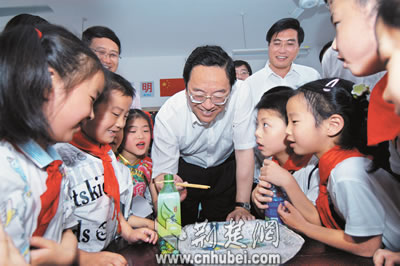 6月1日,武漢市武昌區(qū)為民小學。兩棵高大的榆樹在小小的院子灑滿了濃陰,一群孩子活蹦亂跳玩著游戲。省委書記俞正聲滿面春風地來到了孩子們中間。