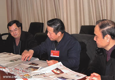 張昌爾說,各新聞單位高度重視“兩會”報道,會前充分準備,作了周詳計劃。會中派出精兵強將,全力以赴。報紙、電視、廣播的報道各自亮點頻出,手法多樣,可讀性可視性可聽性大大增強,較好地反映了代表委員參政議政的風(fēng)采。他希望參加“兩會”報道的新聞工作者繼續(xù)努力,更多地關(guān)注基層代表委員的聲音,報道他們在社會主義民主制度建設(shè)中發(fā)揮的作用,為重大政治性戰(zhàn)役報道落實“三貼近”原則積極探索。圖為張昌爾在評點湖北日報“兩會在線”。