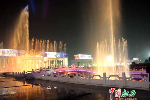百米長(zhǎng)的音樂(lè)噴泉伴隨著《中國(guó)人民解放軍進(jìn)行曲》、《走進(jìn)新時(shí)代》等雄壯的樂(lè)曲翩翩起舞