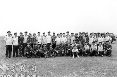 我國首批宇航員在駐鄂空降兵某部圓滿完成傘訓(xùn)任務(wù)后,與部分傘訓(xùn)保障人員合影。前排左二為聶海勝,后排右六為費(fèi)俊龍,后排左六為楊利偉。