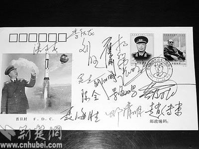 我國首批宇航員在傘訓(xùn)結(jié)束后留給傘訓(xùn)教官李振波的首日封,上面有楊利偉、聶海勝、費(fèi)俊龍、翟志剛、李慶龍、潘占春、劉旺、劉伯明、吳杰、張曉光、景海鵬、趙傳東、陳全、鄧清明14名宇航員的親筆簽名。湖北日報(bào)記者徐和平特約記者趙啟洪攝
