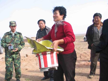 記者在搜索現(xiàn)場看到,從四面八方趕來的牧民群眾個個都有所獲!肮剑藗兂Uf天上掉餡餅,這不應(yīng)驗了?”牧民張金虎指著自己撿到的一堆殘骸,興奮地開著玩笑。牧民烏云還向記者炫耀,她和丈夫烏力吉今天特意起了個大早,在家焚香默默祝愿神舟六號飛船試驗成功,所以今天他們撿到的殘骸最多,能裝滿滿一車。