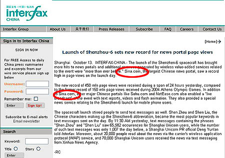 10月14日,俄羅斯國際文傳社報道神六使中國新聞門戶網(wǎng)頁面流量創(chuàng)新高。
