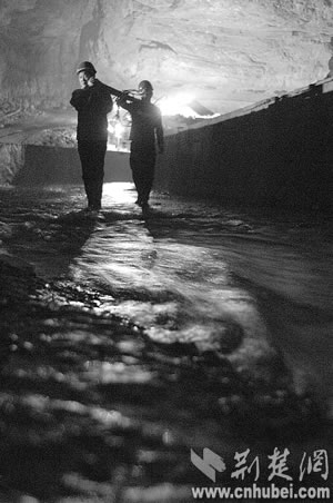 寂寞的蝙蝠第一次接待了人間來(lái)客,沉睡萬(wàn)年的巖溶洞穴第一次迎來(lái)了觀者。但黑暗陌生的世界還是讓堂堂男兒們感覺(jué)了一絲陰森恐怖。他們?cè)?tīng)當(dāng)?shù)匕傩諅髡f(shuō),洞里有巨蟒,所以至今沒(méi)人敢進(jìn)洞!白ゾo時(shí)間測(cè)量!”來(lái)不及恐懼,他們?yōu)樽约汗膭牛驗(yàn)檫@里隨時(shí)可能發(fā)生漲水、墜落等危險(xiǎn)?上,第一次經(jīng)驗(yàn)不足,手電筒的電池很快用完了,一行人只得互相攙扶著,摸索出溶洞!昂髞(lái),我們又進(jìn)去了7次,終于測(cè)出了暗河的具體位置和流向!狈轿奈湔f(shuō)。