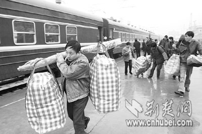 ?10分鐘后,這趟民工專列駛離武昌站,于昨晚20時(shí)20分到達(dá)襄樊。據(jù)武昌站介紹,節(jié)前的民工專列多從南方發(fā)往武漢,節(jié)后武漢鐵路局將加開(kāi)大量南下、東進(jìn)的民工專列。