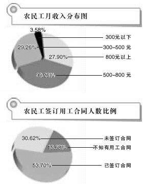 被調查農民工的月工資主要集中在500至800元之間。其中,每月收入在300元以下的占3.58%,300至500元的占29.26%,500至800元的占39.26%,800元以上的占27.90%。