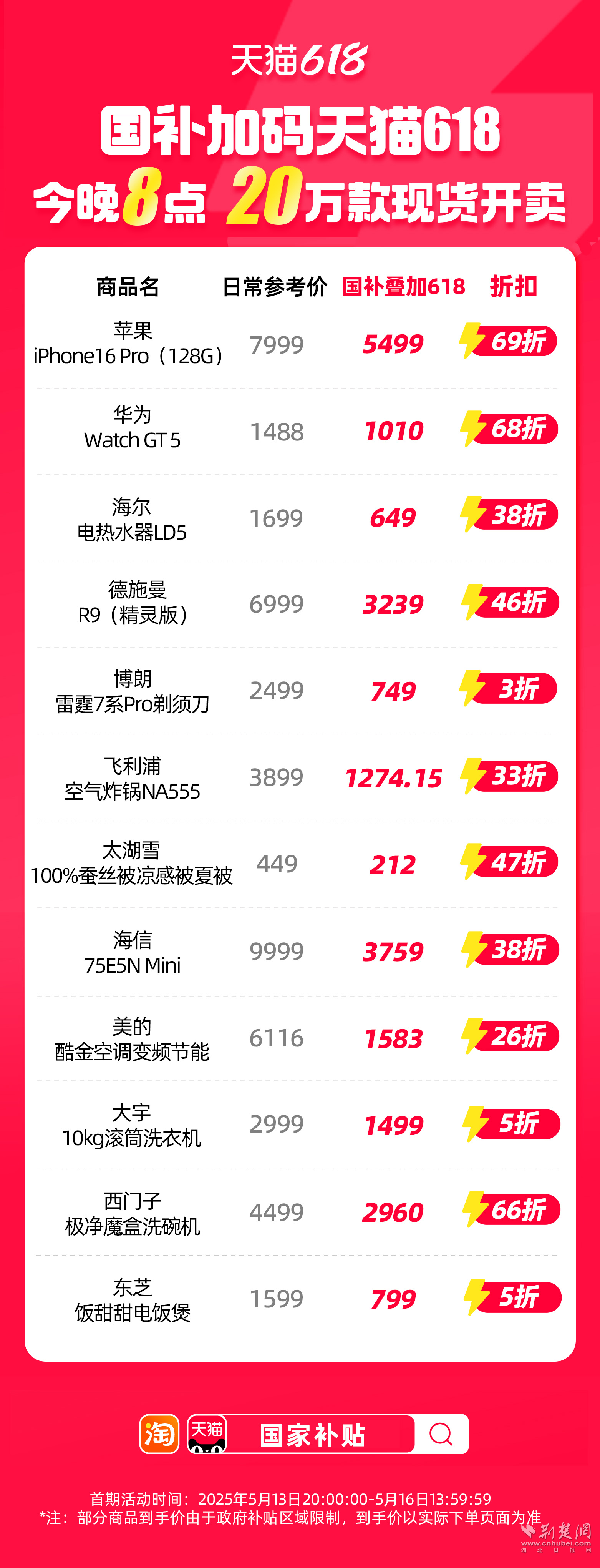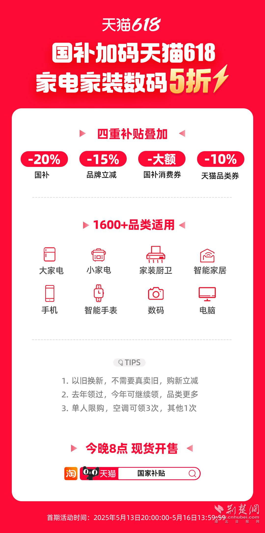 荊楚網(wǎng)(湖北日報網(wǎng))訊(通訊員 朱飛)天貓618重磅加碼國補(bǔ),家電、家裝、家居、3C數(shù)碼等品類將低至5折,今晚8點,現(xiàn)貨開賣。