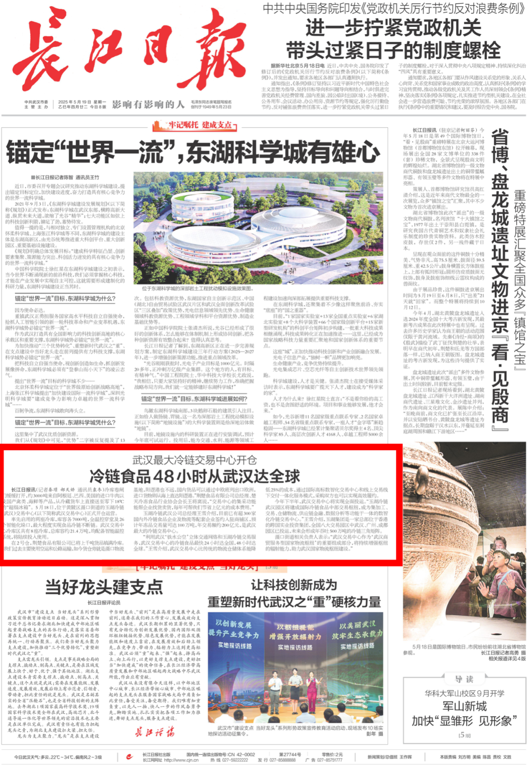 冷庫卷閘門緩緩打開,約3000噸來自阿根廷、巴西、美國(guó)的進(jìn)口牛肉以及國(guó)產(chǎn)禽類、海鮮等產(chǎn)品,從冷藏貨車上直接送至零下18℃的“超級(jí)冰箱”。5月18日,位于黃陂區(qū)灄口街道的玉湖冷鏈(武漢)交易中心(以下簡(jiǎn)稱武漢交易中心)正式開倉(cāng)運(yùn)營(yíng),這也是華中地區(qū)單體最大的冷鏈交易中心首倉(cāng)。