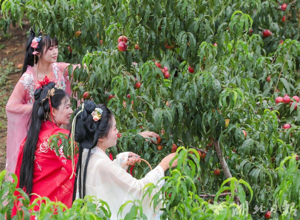 6月10日,穿著漢服的演員在采摘蜜桃。(湖北日報通訊員 陳超 攝)
