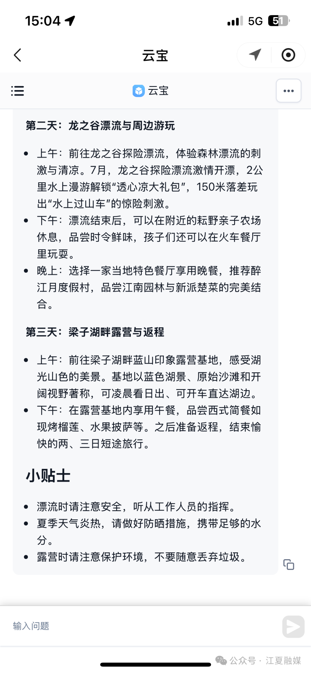 荊楚網(wǎng)(湖北日?qǐng)?bào)網(wǎng))訊 (通訊員 王夫之)暑假臨近結(jié)束,不少家庭都在計(jì)劃一場(chǎng)既能避暑又適合親子互動(dòng)的旅行,但面對(duì)眾多目的地和繁雜的信息,想要規(guī)劃出一條貼合自家需求的完美路線(xiàn),是不是常常讓人犯難,別擔(dān)心,AI云寶來(lái)幫忙!