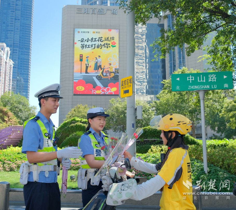 荊楚網(wǎng)(湖北日報網(wǎng))訊(通訊員小雨)8月29日七夕當天,美團在西寧、鄭州、蘭州、深圳、武漢等全國16座城市同步發(fā)起“送你一朵小紅花”交通安全倡導行動。各城市交警在十字路口、斑馬線前為遵守交通規(guī)則的騎手和市民送上鮮花及反光貼紙,傳遞“安全出行”理念。活動現(xiàn)場,近萬人領取到倡導交通安全文明的“小紅花”。據(jù)了解,這是美團在全國發(fā)起的騎手交通安全正向激勵系列活動之一,旨在推動騎手交通安全意識提升與權益保障的常態(tài)化。