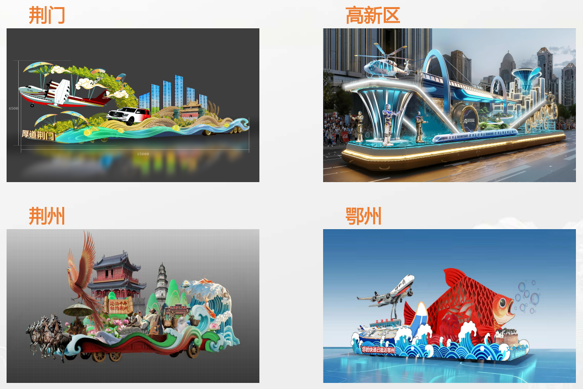3、“楚風(fēng)漢韻”花車:《鳳舞楚天》、《問道武當(dāng)》、《神農(nóng)架梆鼓》、知音號、《西蘭卡普》;