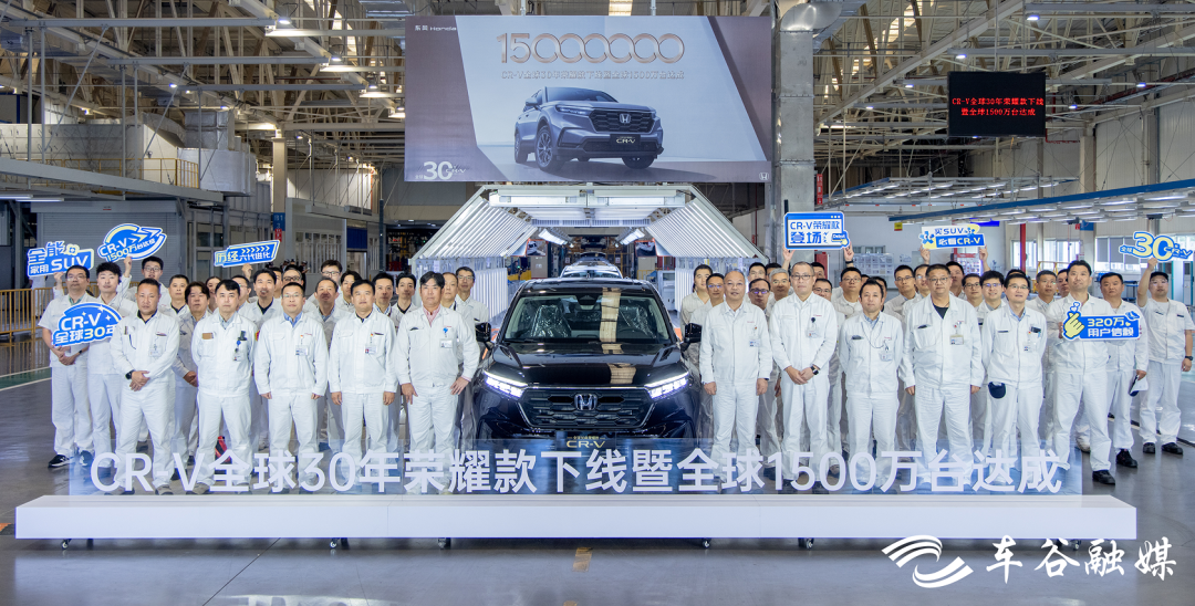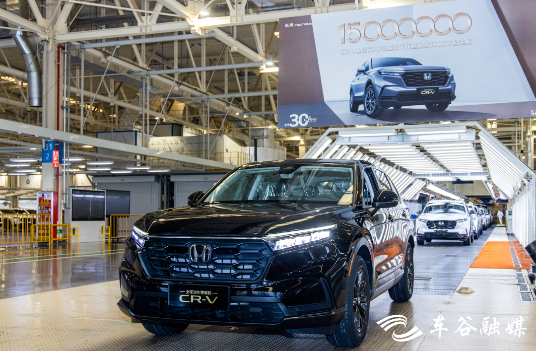 9月15日11時40許,在位于武漢經(jīng)開區(qū)的東風本田第三工廠總裝車間,一輛東風本田CR-V全球30年榮耀款緩緩駛下生產(chǎn)線。同日,CR-V全球累計銷量突破1500萬臺,成為全球最受歡迎的家用SUV之一。