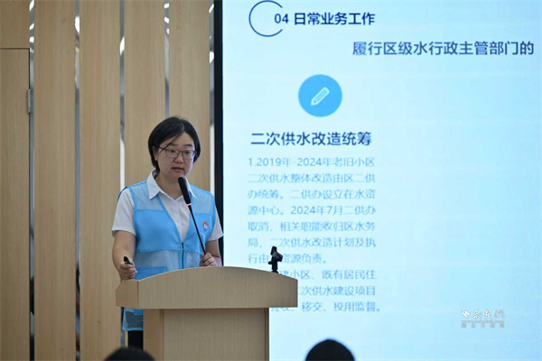 活動(dòng)開(kāi)場(chǎng),武昌區(qū)水資源管理服務(wù)中心主任周妍圍繞《武昌區(qū)水務(wù)和湖泊局及水資源管理中心工作職責(zé)》展開(kāi)解讀,清晰梳理水務(wù)部門在水資源調(diào)配、供水保障、設(shè)施維護(hù)等方面的職能;同時(shí)深入講解二次供水改造及修繕現(xiàn)行政策,從改造標(biāo)準(zhǔn)、申請(qǐng)流程到惠民福利逐一剖析,讓居民明晰這項(xiàng)民生舉措。