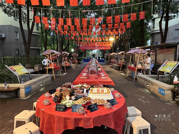 夜幕降臨,團圓宴的香味彌漫開來。此前社區(qū)發(fā)布的“團圓宴”菜品招募令得到熱烈響應(yīng),居民們帶著自家拿手菜齊聚一堂,轄區(qū)愛心企業(yè)和商戶也端來精心準備的菜品。紅燒排骨色澤誘人、手工餃子飽含心意、梅菜扣肉香氣撲鼻……百余道家常菜擺滿長桌,構(gòu)成一幅“百家宴、百家味”的溫馨畫卷。大家端著餐盤穿梭其間,分享美食、交流廚藝,陌生的鄰里因一道菜熟絡(luò)起來,熟悉的街坊借一碗湯增進情誼。社區(qū)還聯(lián)合東湖康養(yǎng)養(yǎng)老服務(wù)中心邀請轄區(qū)10位高齡老人代表與祖國“同慶生”,全場齊唱《生日歌》,共同切分生日蛋糕,甜蜜的滋味伴著歡聲笑語,溫暖了在場每一位居民的心。