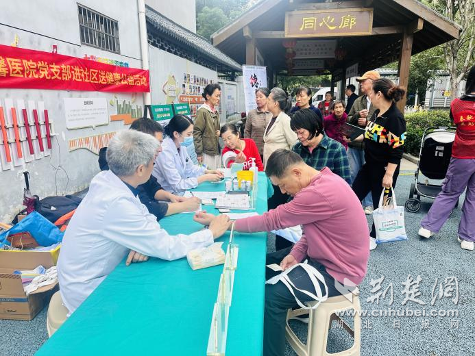 在另一角落,醫(yī)護(hù)人員耐心講解健康知識,社??ㄞk理區(qū)的漢口銀行工作人員忙個不停,為居民免費(fèi)辦理社??ㄉ墭I(yè)務(wù)。
