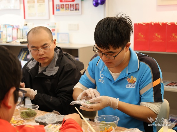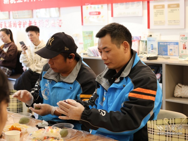 在制作青團時,現(xiàn)場同步開展“黃鶴家人茶話會”,搭建起代際對話的橋梁?;ǖ躺鐓^(qū)紫陽之星小區(qū)黨支部書記金文芳講述了小區(qū)變遷故事,傳遞長者對騎手們的關懷;新就業(yè)群體入黨積極分子樂倩倩則分享了送餐途中幫扶孤寡老人的暖心經歷。兩代人的真誠交流深化了情感共鳴,現(xiàn)場洋溢著家人般的溫暖氛圍。