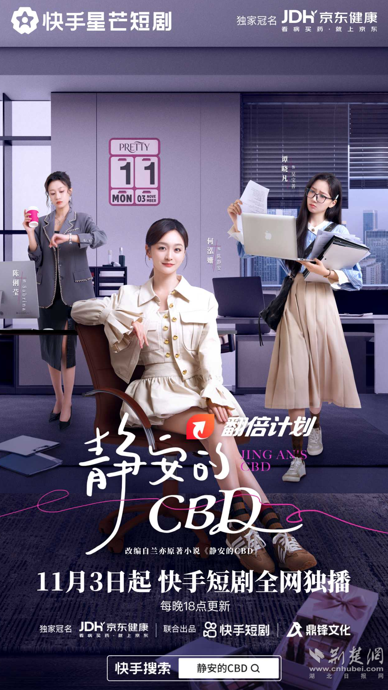 荊楚網(wǎng)(湖北日?qǐng)?bào)網(wǎng))訊(通訊員 恩正)畫最愛的女神妝,走最颯的職場(chǎng)路。近日,都市職場(chǎng)題材短劇《靜安的CBD》宣布定檔,將于11月3日在快手短劇進(jìn)行全網(wǎng)獨(dú)播。據(jù)悉,該劇由京東健康獨(dú)家冠名,快手與鼎鋒文化共同出品,孔令飛傾情執(zhí)導(dǎo),何泓姍領(lǐng)銜主演,將用22集篇幅描繪跨越代際的女性職場(chǎng)群像,呈現(xiàn)Z世代女孩的青春奮斗故事。
