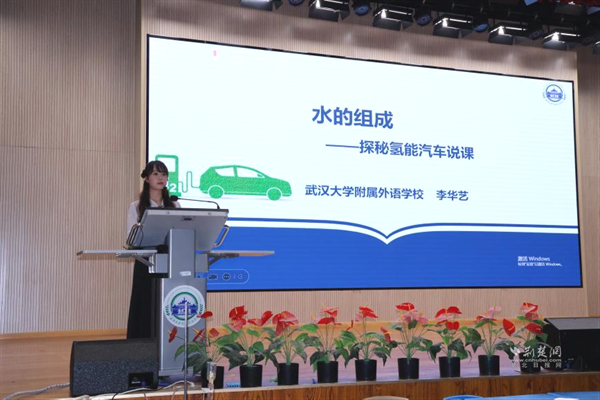 武漢大學(xué)附屬外語學(xué)校李華藝老師執(zhí)教《水的組成——探秘氫能汽車》展示課。課程以新能源汽車為線索,設(shè)計四大項目,學(xué)生通過海報、角色扮演等形式展示探究成果。李老師引導(dǎo)學(xué)生從宏觀、微觀、符號三重視角認識水的組成,最終用電解產(chǎn)生的氫能讓小車現(xiàn)場行駛,實現(xiàn)化學(xué)與科技的有機融合。說課環(huán)節(jié)中,她介紹項目圍繞“氫能汽車如何工作”展開,借助AI模擬生產(chǎn)過程,讓學(xué)生感受化學(xué)的實踐價值。