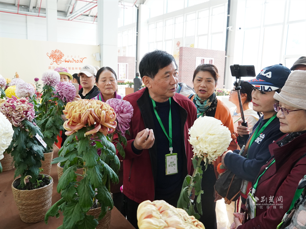 今年67歲的辛高爐擁有40多年菊花栽培經(jīng)驗(yàn),其培育的菊花品種與插花作品曾多次榮獲全國(guó)大獎(jiǎng)。他結(jié)合自己多年的養(yǎng)花心得,將菊花品種特性、造型技巧與養(yǎng)護(hù)要領(lǐng)娓娓道來(lái),不僅吸引園藝師凝神傾聽(tīng),更引得沿途市民駐足圍觀。