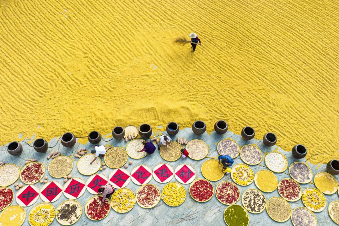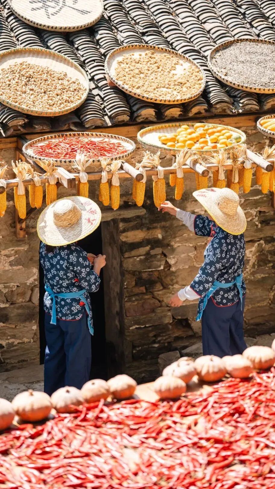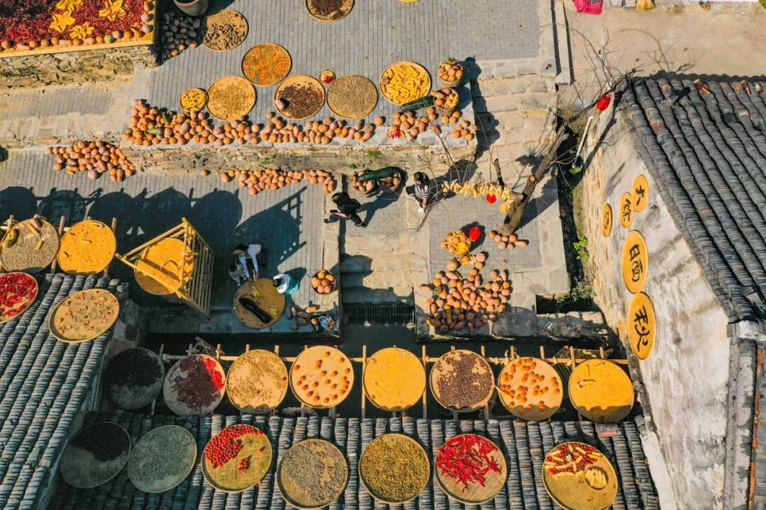 這不是擺設(shè)或表演,是真實(shí)的生活場(chǎng)景。家家戶戶門口擺放的竹匾里,晾曬的是他們一年勞作的收獲。