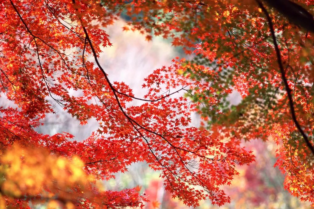 綿延的山谷像打翻的調(diào)色盤,紅色是主調(diào),其間點(diǎn)綴著金、橙和綠色,錯(cuò)落有致,構(gòu)成一幅溫暖的秋景長(zhǎng)卷。