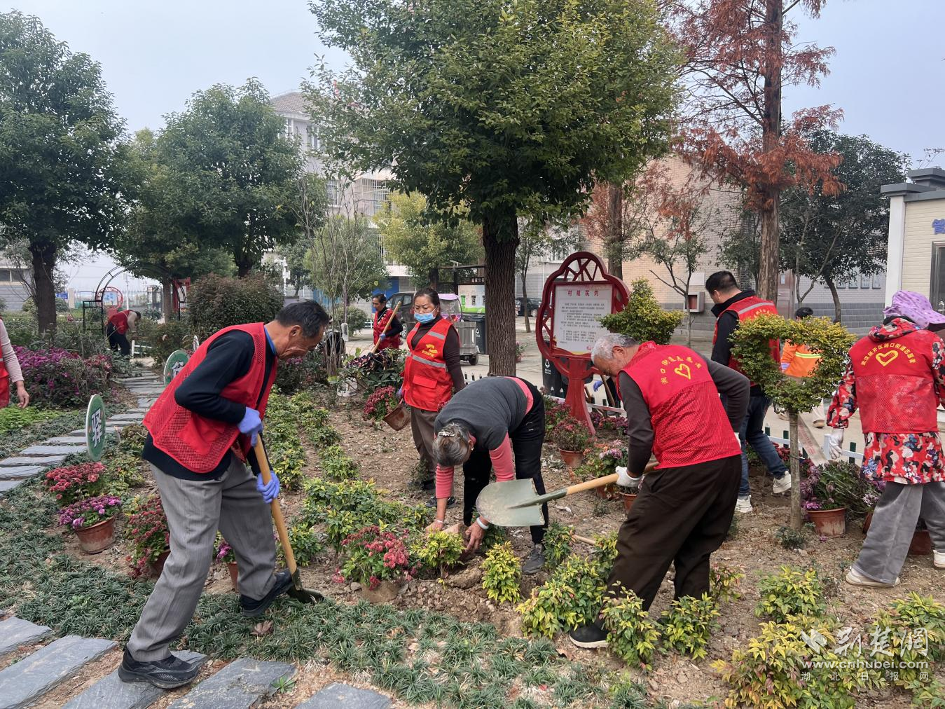社區(qū)志愿服務(wù)隊與下沉黨員一起培育菊花。通訊員供圖