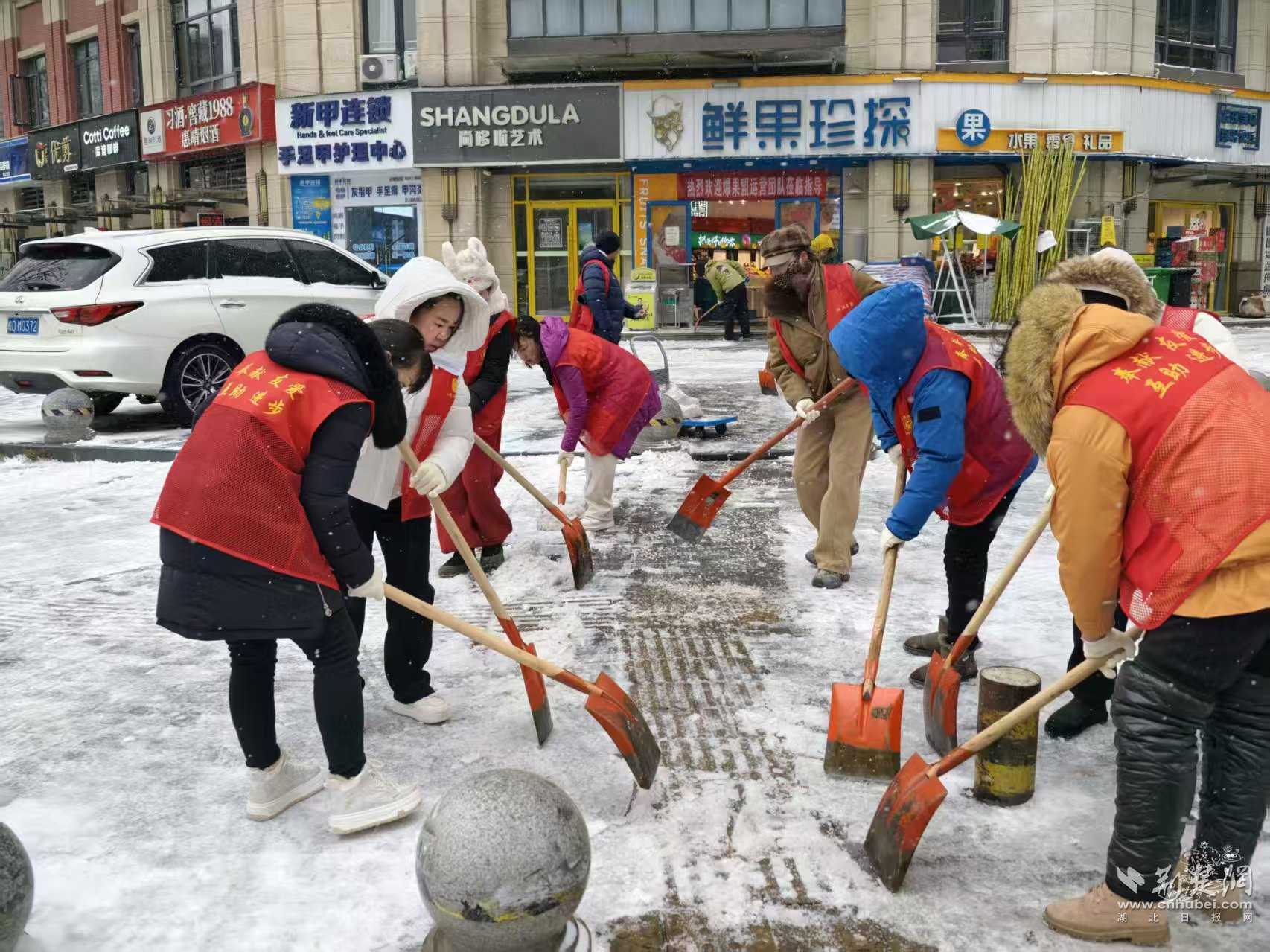 陳家墩社區(qū)則結(jié)合老舊小區(qū)多、坡道多的實際情況,提前明確分片包干責(zé)任,將單元門口、背街小巷和易結(jié)冰路段列為重點區(qū)域,組織街道工作人員與社區(qū)黨員志愿者、熱心居民并肩作戰(zhàn)。雪花落滿肩頭、化成水珠,大家卻顧不上拍一拍,鏟一鍬、掃一段、清一處,干勁十足。“看到路面上積雪都清理干凈了,才放下心來。”