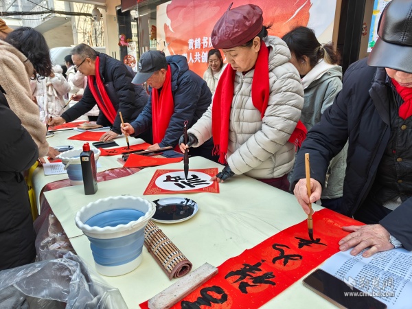 外場(chǎng)體驗(yàn)區(qū)更是精彩紛呈。在定制春聯(lián)區(qū),95歲高齡的社區(qū)居民黃勁勇老先生帶領(lǐng)首義書畫協(xié)會(huì)的老師們現(xiàn)場(chǎng)揮毫,筆走龍蛇。一副副對(duì)聯(lián)、一張張福字,承載著真摯祝福與新年期盼,吸引居民有序排隊(duì)領(lǐng)取。親子手工區(qū)、便民服務(wù)角與特色年貨市集同樣人氣高漲,居民在參與中感受文化、享受服務(wù)、樂購(gòu)年貨。