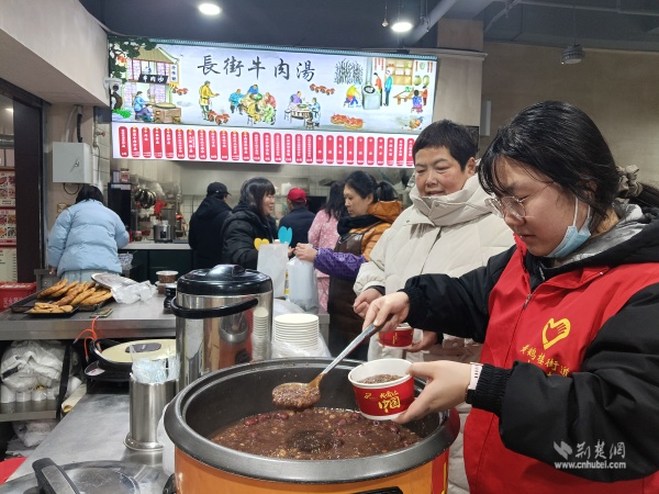 溫暖派送覆蓋多元群體。在戶外勞動(dòng)者驛站,環(huán)衛(wèi)工人、快遞外賣騎手從志愿者手中接過(guò)熱粥;社區(qū)還鏈接武漢市第三醫(yī)院資源,為戶外工作者提供健康咨詢。幾位外賣騎手主動(dòng)化身“公益騎手”,與黨員志愿者一同將暖心粥品送至“鶴耋安”高齡獨(dú)居老人家中。黨員志愿者還走訪了周邊商戶、殘疾人家庭及退役軍人家屬,并在社區(qū)設(shè)點(diǎn)邀請(qǐng)居民共享溫情。一碗粥,沿著黨員和志愿者的溫暖足跡,流入社區(qū)每個(gè)角落。