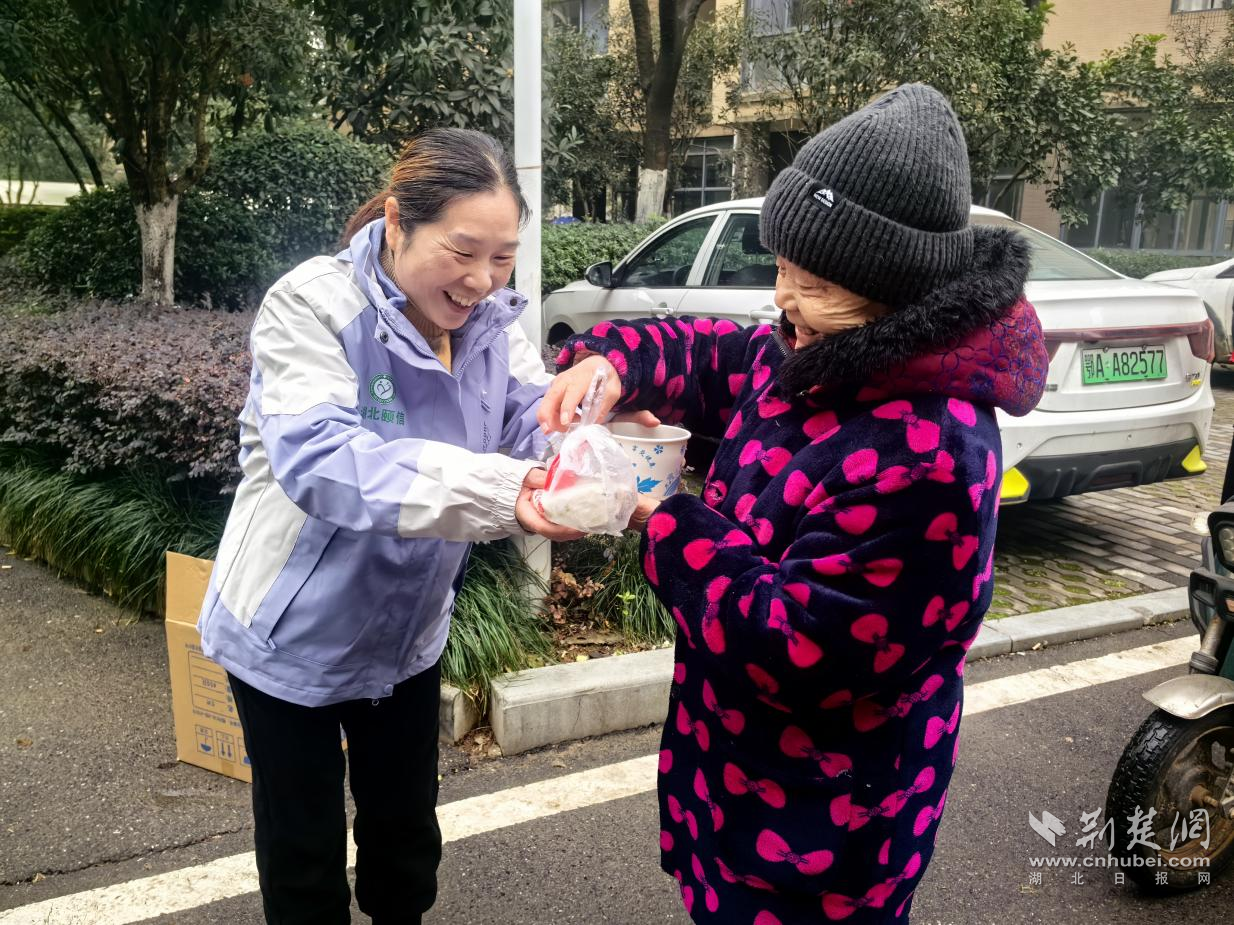小軍山社區(qū)老年居民開心地接過社區(qū)送出的臘八粥。通訊員供圖