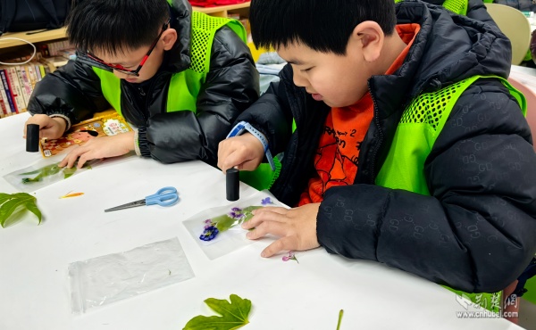 “童心造紙術(shù)·愛心拓染坊”課程把非遺技藝帶進課堂。孩子們親手體驗古法造紙,并用采集的桂花葉、香樟葉進行植物拓染,將自然的紋理留存在紙上。這些拓印作品被精心制作成新年書簽,成為送給家人的“有溫度的禮物”。
