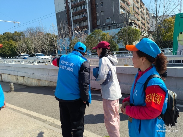 看到游客們想在黃鶴樓前合影留念,志愿者們主動(dòng)上前幫忙,教大家擺姿勢(shì),定格下登樓祈福的美好瞬間,讓游客感受江城的溫情。他們還隨手撿拾轄區(qū)及景區(qū)外圍的垃圾,勸導(dǎo)不文明行為,用實(shí)際行動(dòng)維護(hù)環(huán)境的整潔美觀,守護(hù)著名樓的生態(tài)與文明顏值。