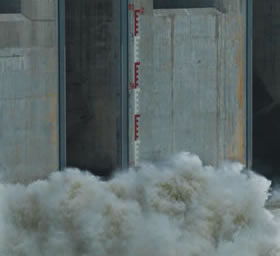 大壩下游,浪花濺上68米標(biāo)尺點(diǎn)。