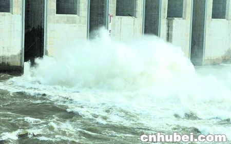 昨日,三峽大壩上游水位已達(dá)89.36米,下游水位66.42米。晚6時(shí),大壩泄洪閘旁,波濤洶涌;而大壩上游,水波不興,江水如鏡。 楚天都市報(bào)記者陳建剛楊峰洲攝