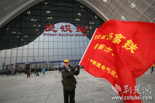 一位武漢站的建設(shè)者在站前廣場揮動旗幟,今天他們將坐上首列開往廣州的高鐵。