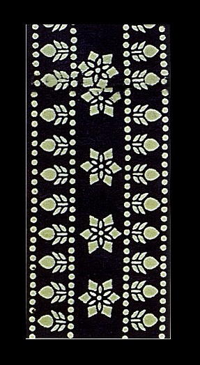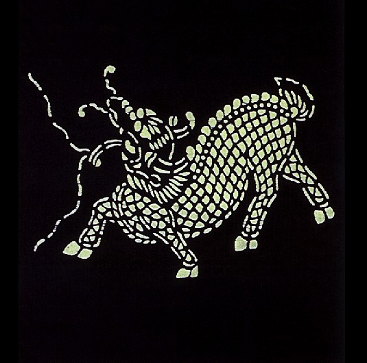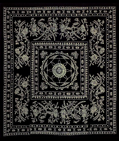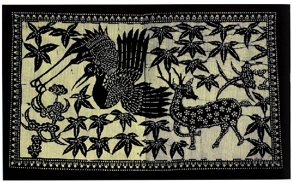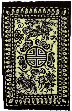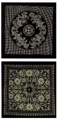 藍(lán)印花布遍及湖北全省,尤以天門(mén)藍(lán)印花布最負(fù)盛名。其特點(diǎn):1、藍(lán)與白的選擇,藍(lán)白兩色并非吉祥色,然而經(jīng)過(guò)藝人們的巧妙的藝術(shù)處理,使人感到清新明快;2、虛與實(shí)的結(jié)合:以點(diǎn)組成線(xiàn),以線(xiàn)組成面,若合若離,似為一體,實(shí)又分離。